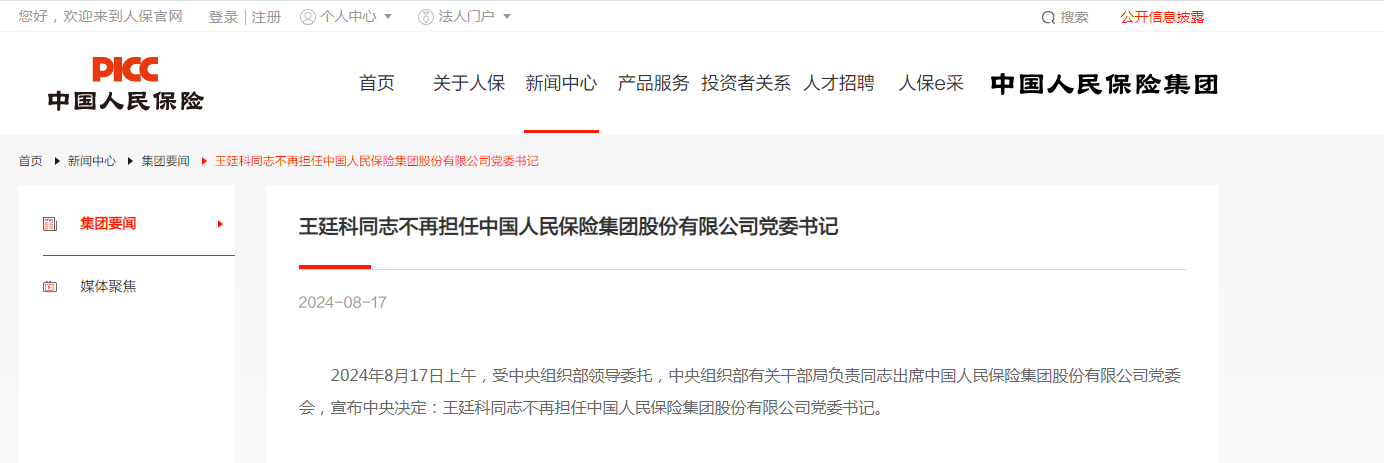 据中国人民保险集团官网消息在线炒股配资服务,2024年8月17日上午,受中央组织部领导委托,中央组织部有关干部局负责同志出席中国人民保险集团股份有限公司党委会,宣布中央决定:王廷科同志不再担任中国人民保险集团股份有限公司党委书记。