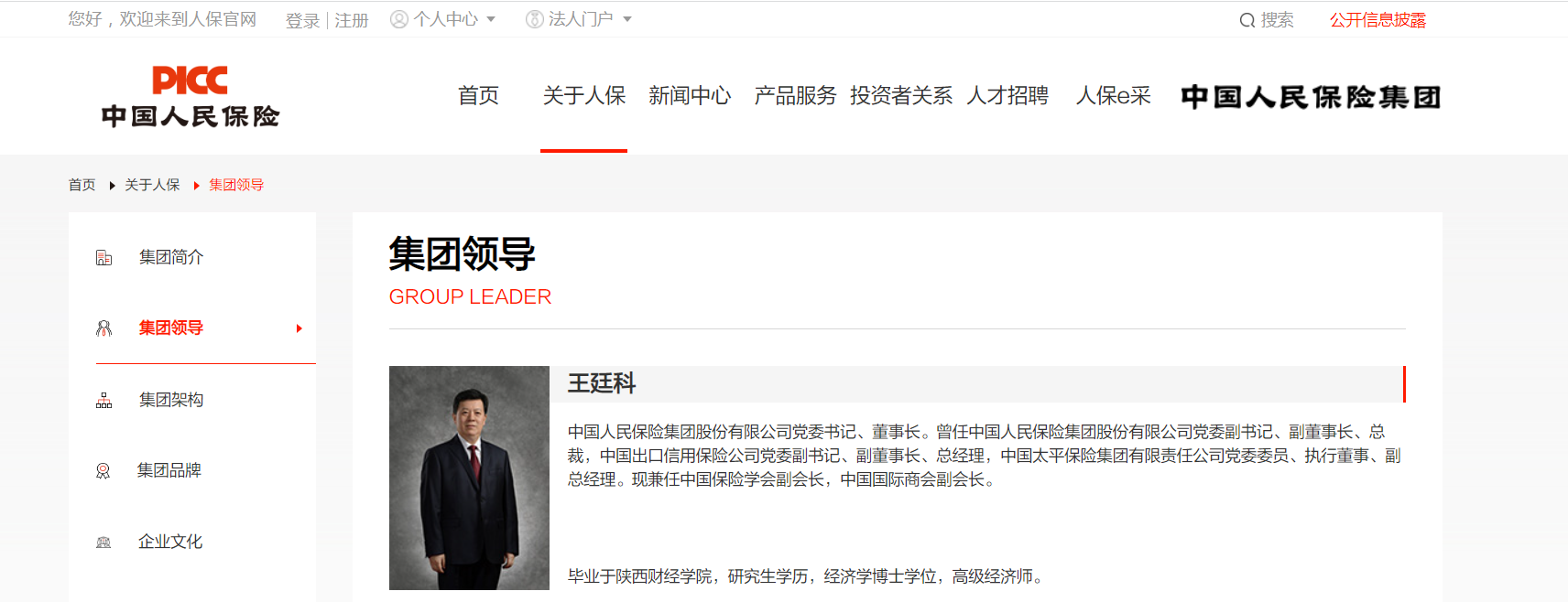 据中国人民保险集团官网,王廷科曾任中国人民保险集团股份有限公司党委副书记、副董事长、总裁,中国出口信用保险公司党委副书记、副董事长、总经理,中国太平保险集团有限责任公司党委委员、执行董事、副总经理。现兼任中国保险学会副会长,中国国际商会副会长。