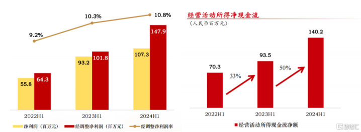 在盈利能力方面,公司上半年实现毛利约4.01亿元,同比增长41.8%;经调整净利润约为1.48亿元,同比增长45.3%;经营活动所得净现金流为1.40亿元,同比增长50%。可以看到,过去几年,固生堂的经调整净利润和经营性现金流入均呈现持续增长的趋势,不仅预示着公司盈利能力的持续强化,也反映出其在运营管理和资金利用效率上的优化。