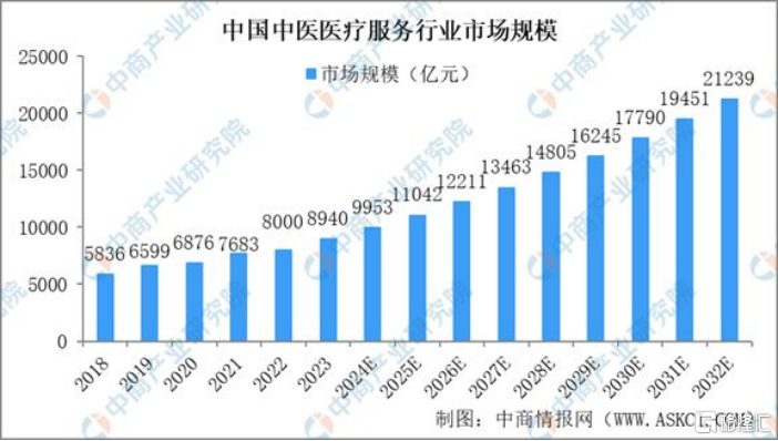 中商产业研究院数据显示,随着人口老龄化的加剧,中国中医医疗服务行业市场规模预计将在2025年突破万亿大关,并在2032年达到超2万亿市场规模。这一显著的增长,不仅反映了市场对中医药服务的迫切需求,也预示着行业的广阔前景。