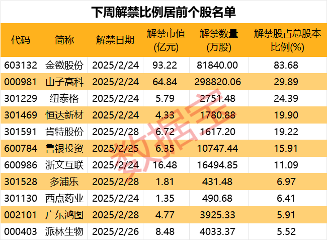 下周A股解禁市值超220亿元