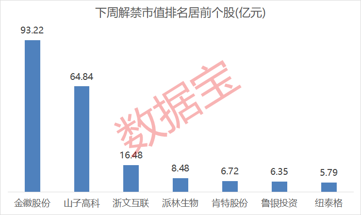 从解禁规模上看,7股解禁市值超过5亿元。金徽股份解禁市值居首,为93.22亿元;山子高科解禁市值为64.84亿元;浙文互联解禁市值为16.48亿元;派林生物、肯特股份、鲁银投资、纽泰格解禁市值均超5亿元。